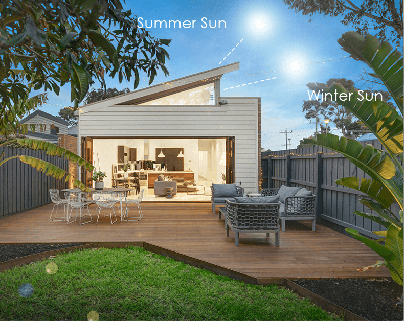 An example of a recommendation in our ESD design guidelines is that houses are oriented to make appropriate use of solar energy. In addition, dwelling design could incorporate simple improvements such as the roof design below – which provides a simple way to maximise winter sun and minimise summer sun.