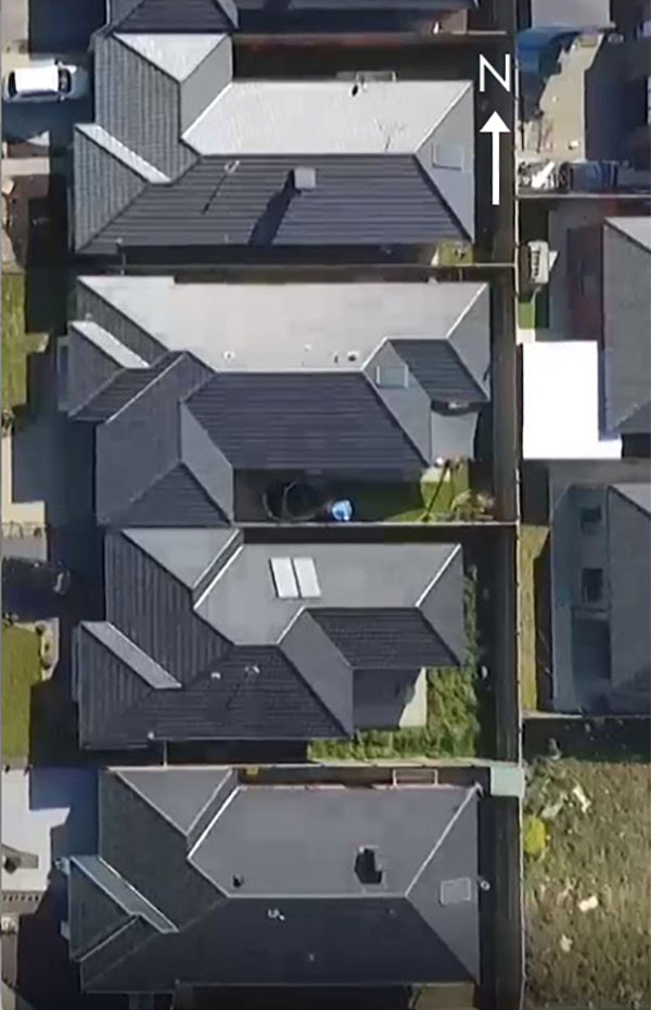 Too often in greenfield developments, houses are situated in on blocks such that the chance of winter sun entering internal living or outdoor spaces is limited. This restricts the chance for winter passive heating of the dwelling or creating an enjoyable winter garden. Living rooms and outdoor spaces of these houses will be colder and gloomy in winter. The picture here from Google maps confirms the unfortunate design and positioning of some houses in this way.